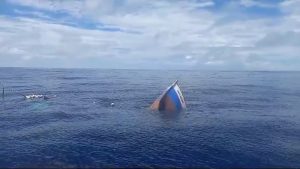 Em um vídeo feito pelos pelos tripulantes da embarcação que fez o resgate, é possível ver apenas a proa (parte frontal) da embarcação e parte da estrutura pesqueira boiando em alto-mar.