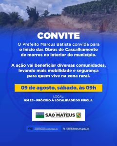 De acordo informações da secom o prefeito Marcus Batista estara neste sabado dia 09 de agosto na região dos kms juntamente com os vereadores Branco da penal e schaeffer, sendo as 9:00 horas no km 25 proximo ao pirola, onde dara o início das obras de cascalhamento de morros no interior do município. A ação vai beneficiar diversas comunidades com melhores condições de acesso e qualidade de vida facilitando bem como facilitando o escoamento da produção agricola .